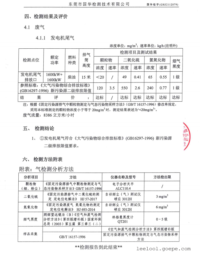 *终第三方检测单位检测结果为:满足广东省《大气污染物排放限值》DB44/27-2001标准中表2工艺废气大气污染物排放限值第二时段中要求:“SO2<500mg/m3、NOx<120mg/m3、颗粒物<120mg/m3”,并由有资质的第三方检测单位出具合格检测报告。