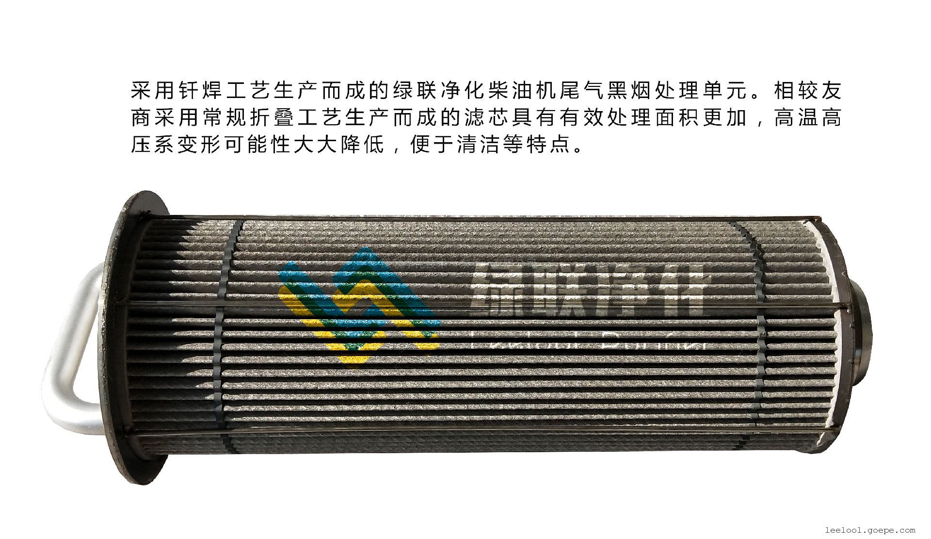 第三代金属滤芯的特点第三代干式黑烟净化器金属滤芯展开后有效过滤面积可达1.3m2,规格为φ155×H293匹配应急备用柴油机排气量为4-4.5L/只,处理有效的过滤面积较大,配合高强度及密封的箱体设计,整套净化器的开机背压小于1kPa,对柴油发电机组工作无影响;针对于应急备用设计,以处理柴油机启动一口黑烟为主,黑烟处理效率达到95%以上,处理后达到林格曼黑度一级以下,对比处理前后的效果明显。作为针对应急柴油发电机组黑烟治理的一款经济型产品,第三代黑烟净化器箱体采用2-3mm的碳钢/409不锈钢,外涂覆耐高温银漆,旁通采用耐高温防雨对夹阀门,滤芯采用316L材料特制而成的滤材,滤材以钎焊工艺折波生产而成,高温下抗氧化性较好,高压气流冲击不易变形。