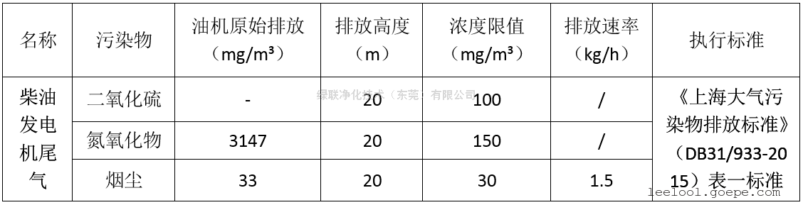 从《上海大气污染物排放标准(DB31/933-2015)》中可以看到柴油发电机组尾气污染物排放限值要求为:“SO2<100mg/m³、NOx<150mg/m³、颗粒物<30mg/m³”。柴油机满载时NOx排放浓度3147 mg/m³,治理到150 mg/m³,治理效率95.23%。本项目*终按照此标准执行,并以有资质的第三节检测单位检测出具的检测报告来验收。