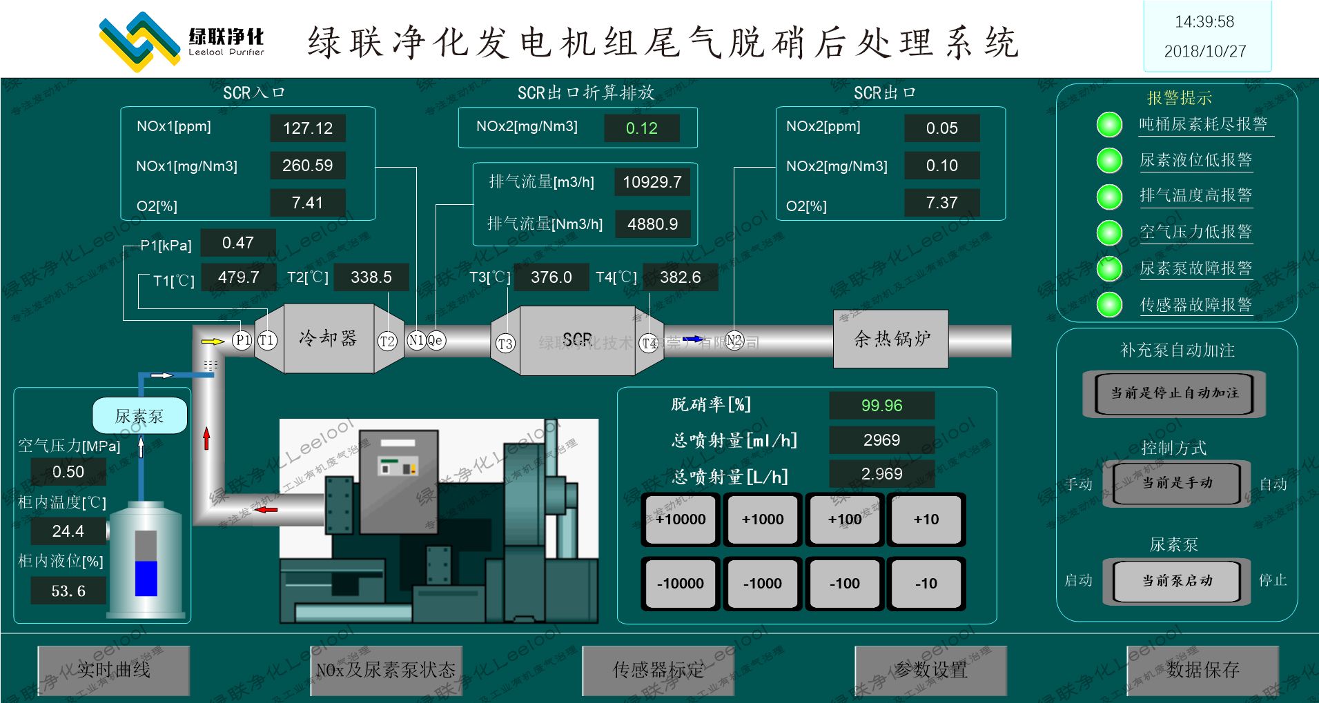 本系统根据目标发动机治理需求,在混合管前端通过前NOx传感器、温度传感器采集尾气参数及功率大小等一并传输给PLC控制尿素喷射量。在SCR反应器出口端通过NOx传感器、温度传感器、氨逃逸传感器(可选)等采集处理后的NOx含量,出口温度和NH3浓度 (通过可选传感器实现)。在系统液晶控制显示屏上会实时显示出对应的数据,不需要单独采购烟气分析仪分析处理后烟气成分。本系统数据可自动同步到云端,通过手机可实时监测实际排放指标。